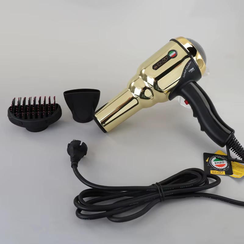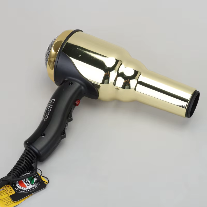 مجفف شعر إنزو EN-2999 أيوني سريع التجفيف بتصميم معدني ذهبي و موتور تيار متردد بقوة 1845 واط وسرعة محرك تصل إلى 21000 دورة/دقيقة. مثالي للاستخدام المنزلي والصالونات، مع فوهة مكثّفة ومفتاحَيْ تحكّم بالسرعة.